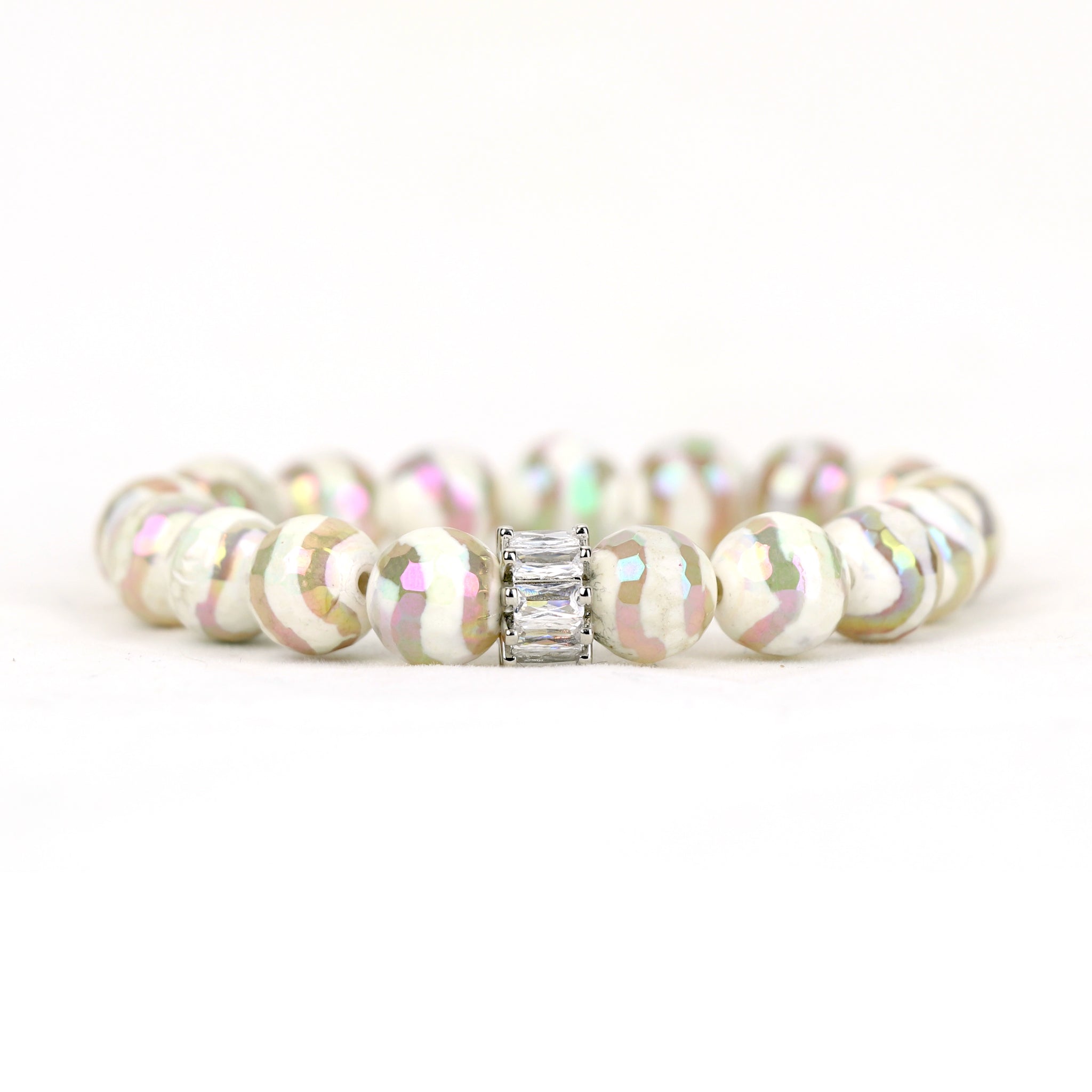 A soft swirl of opalescent whites and iridescent shimmer, Cloud Nine feels like floating above the everyday. Faceted beads catch the light like tiny rainbows, while crystal accents add a touch of champagne sparkle. Stack it up for an airy, dream-like glow that’s perfect for “yes” moments, date nights, and every little thing that makes you feel blissfully, gently happy.