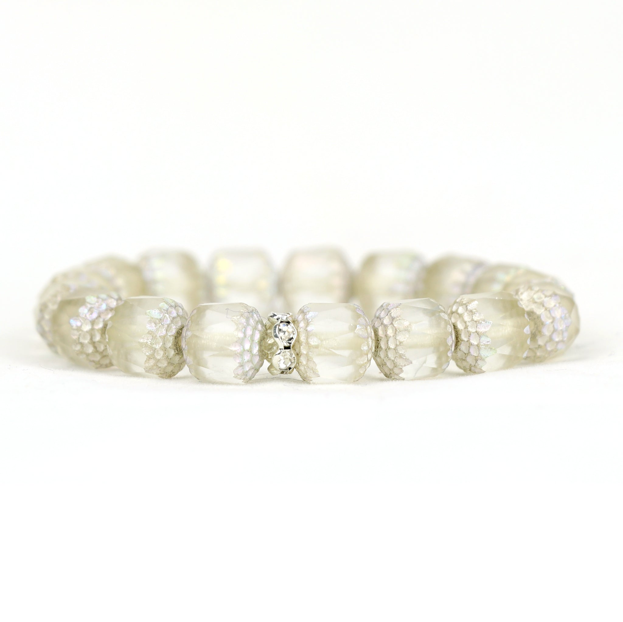 A soft swirl of opalescent whites and iridescent shimmer, Cloud Nine feels like floating above the everyday. Faceted beads catch the light like tiny rainbows, while crystal accents add a touch of champagne sparkle. Stack it up for an airy, dream-like glow that’s perfect for “yes” moments, date nights, and every little thing that makes you feel blissfully, gently happy.