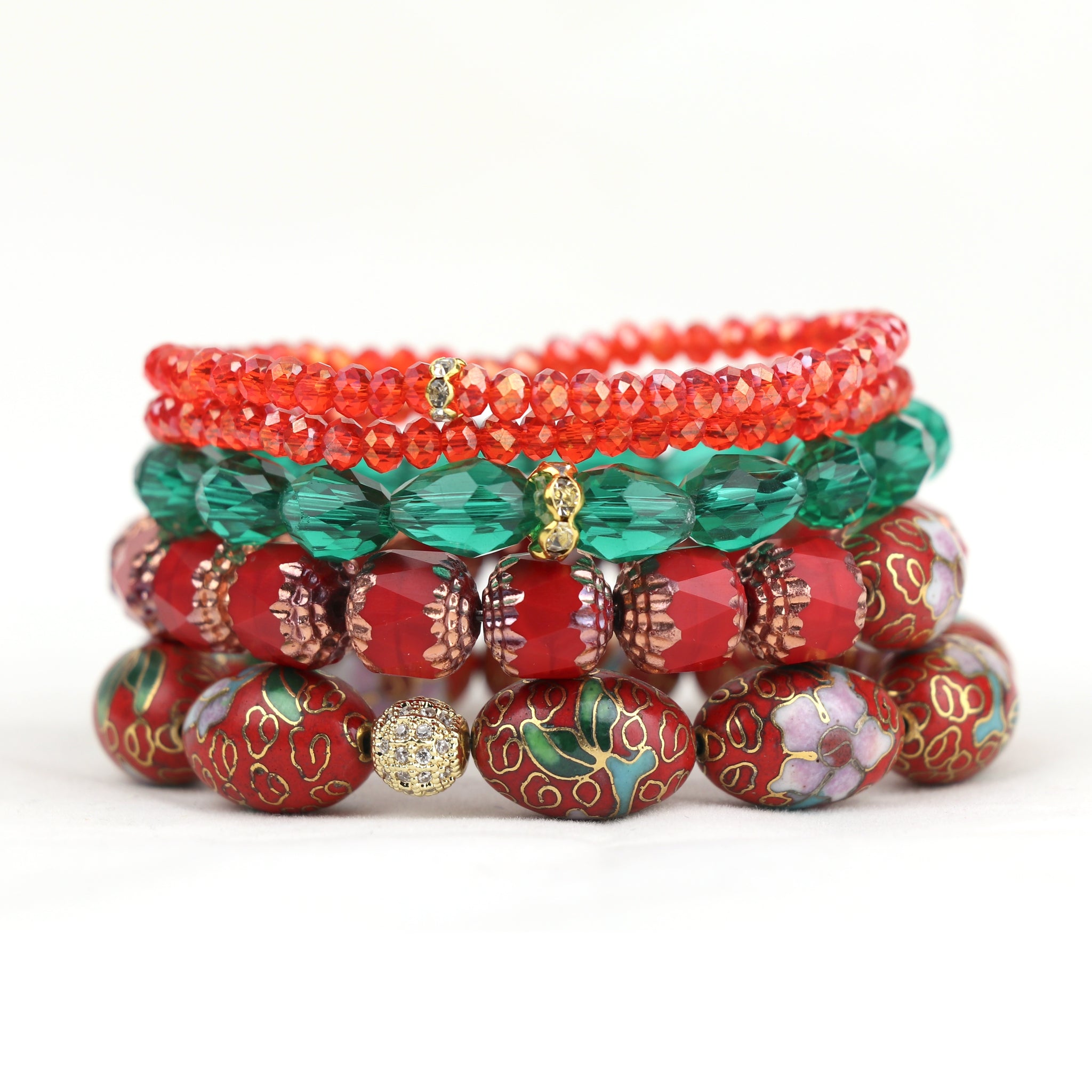 Step into an old-world winter garden. Scarlet Jardin is a lush, storybook escape. Deep scarlet crystals, emerald glass, and cloisonné blooms that feel plucked from a gilded parlor or a century-old jeweled box. Each bracelet is rich with detail: golden filigree, enamel florals, and faceted beads that catch the light like candle flames on polished silver.