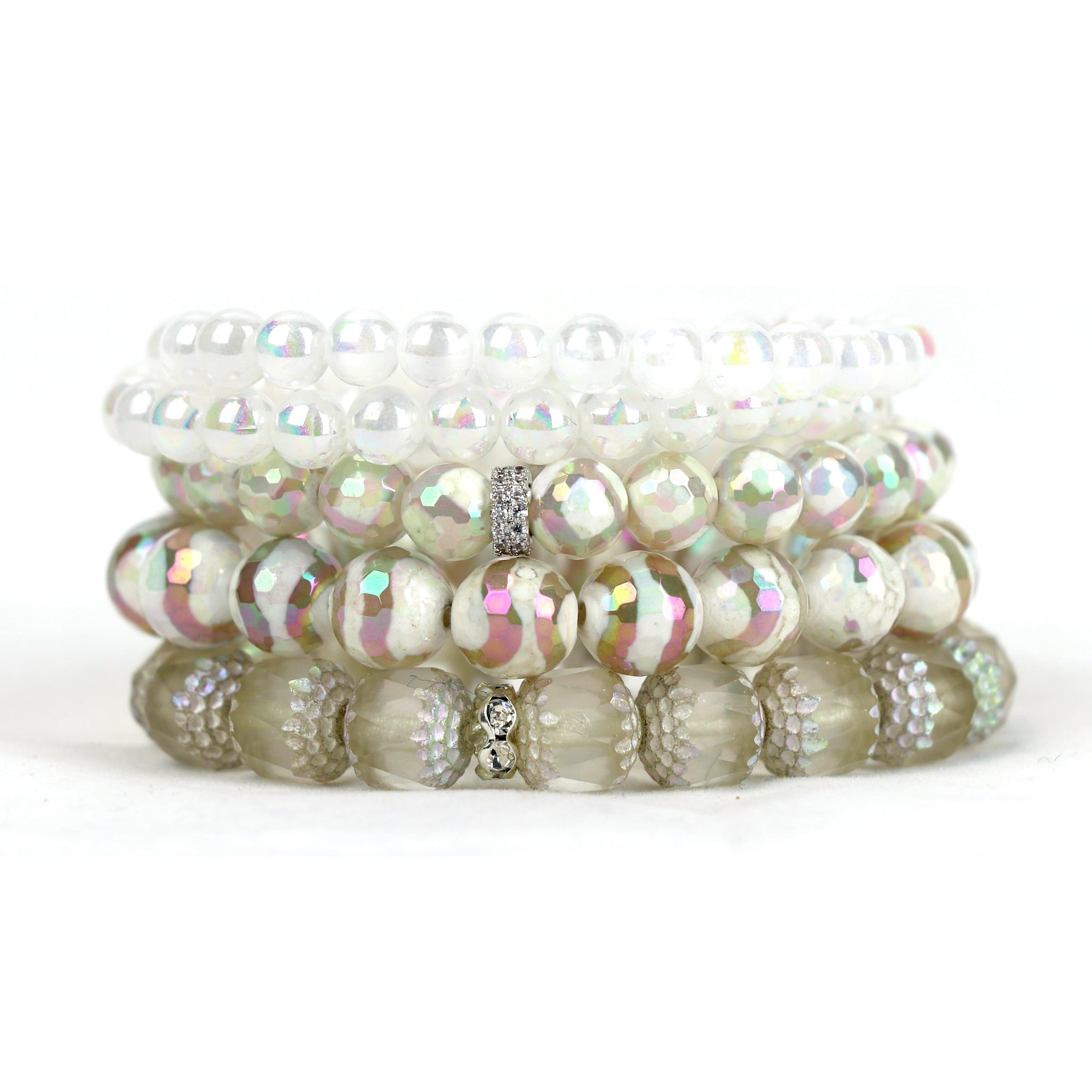 A soft swirl of opalescent whites and iridescent shimmer, Cloud Nine feels like floating above the everyday. Faceted beads catch the light like tiny rainbows, while crystal accents add a touch of champagne sparkle. Stack it up for an airy, dream-like glow that’s perfect for “yes” moments, date nights, and every little thing that makes you feel blissfully, gently happy.